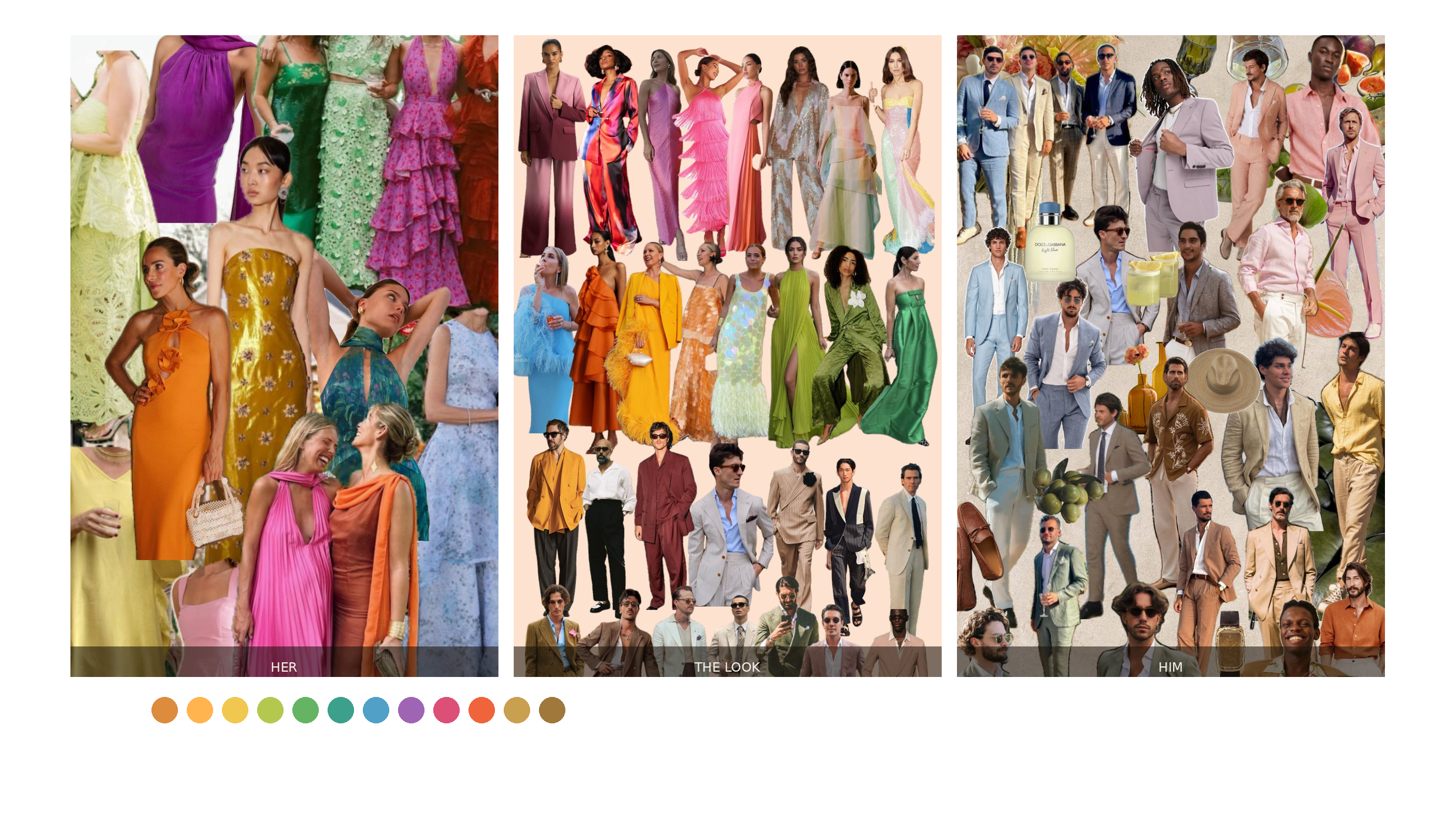 Kick off the weekend in style. For the welcome party, we're thinking vibrant, festive, and effortlessly chic — the kind of look that belongs on a rooftop in Ortigia with a Campari in hand. Cocktail dresses, midi lengths, bold prints, and chic separates are all at home here. For him, think linen or lightweight suits and sport coats in warm, earthy tones — relaxed but polished. For her, color and print are celebrated. Lean into the warmth of a Sicilian October evening. Out of respect for the bride and groom, please kindly refrain from wearing white, ivory, or cream.